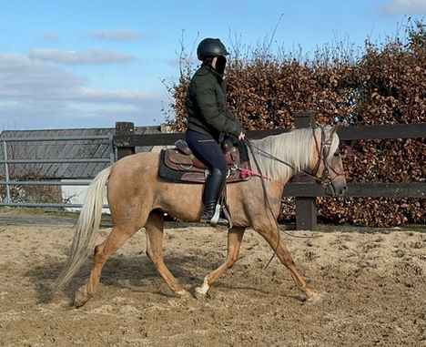 Zum Verkauf sehr eine super brave 4 Jahre alte, etwa 152cm große Stute in toller Sonderfarbe. Sie ist für ihr Alter schon sehr abgeklärt und läuft in allen Gangarten im Gelände und auf dem Reitplatz. Dabei ist sie absolut brav und zeigt keinerlei Unarten. Sie ist einfach zu reiten und hört dem Reiter gut zu. Sie geht angenehm vorwärts und ist kein Rennpferd. Sie zeigt sehr schöne Bewegung ist wäre bei weiterer Ausbildung vielseitig einsetzbar. Bisher ist sie freizeitmäßig klassisch geritten und kennt den Dressur sowie den Westernsattel.